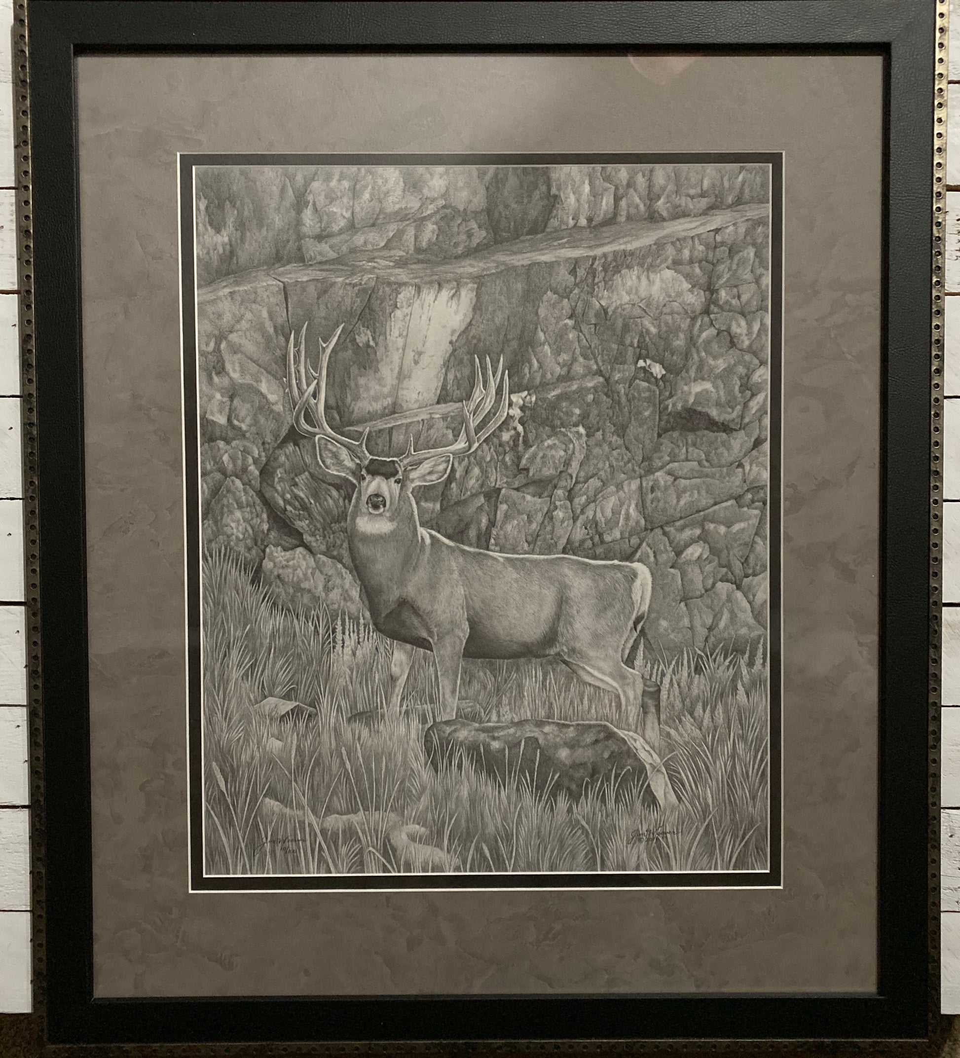 Big bucks like to lay up against a safe rock wall to hide their afternoon away and will rarely move - unless you happen to walk into their bedroom! This buck is “Caught”, but he’ll be on the move momentarily! This is the famous “38 Special” a buck from Antelope Island, Utah. This drawing is permitted by Doyle Moss, based on one of his photographs of this impressive mule deer. Jim’s drawing won “Best of Show” at the Tulelake-Butte Valley Fair in Northern California in 2017. The original has sold. (Image size 16x20)
